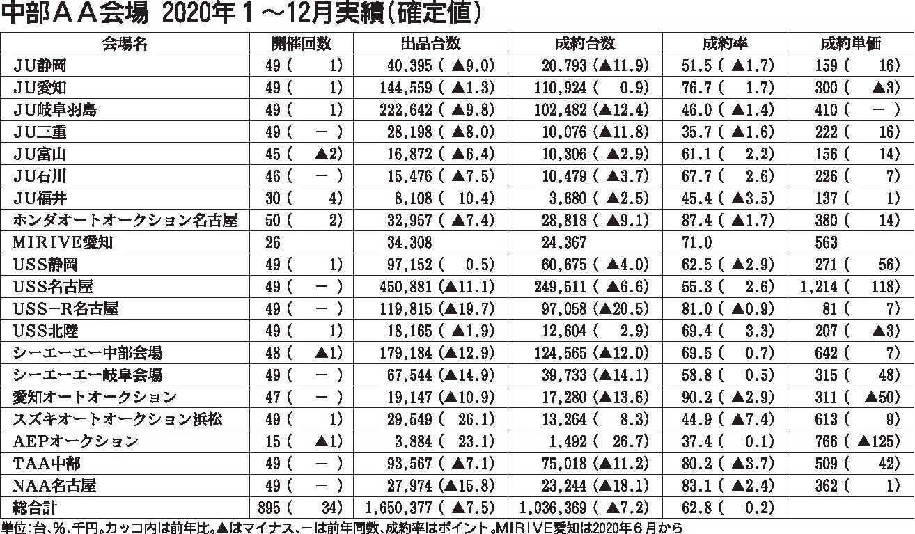 2020年の中部7県(愛知、岐阜、三重、静岡、富山、石川、福井)の中古車オークション(AA)会場の実績(日刊自動車新聞社まとめ)は、全20会場のうち16会場で年間出品・成約台数がともに前年実績を下回った。中部地方には新たにAA会場が誕生し...