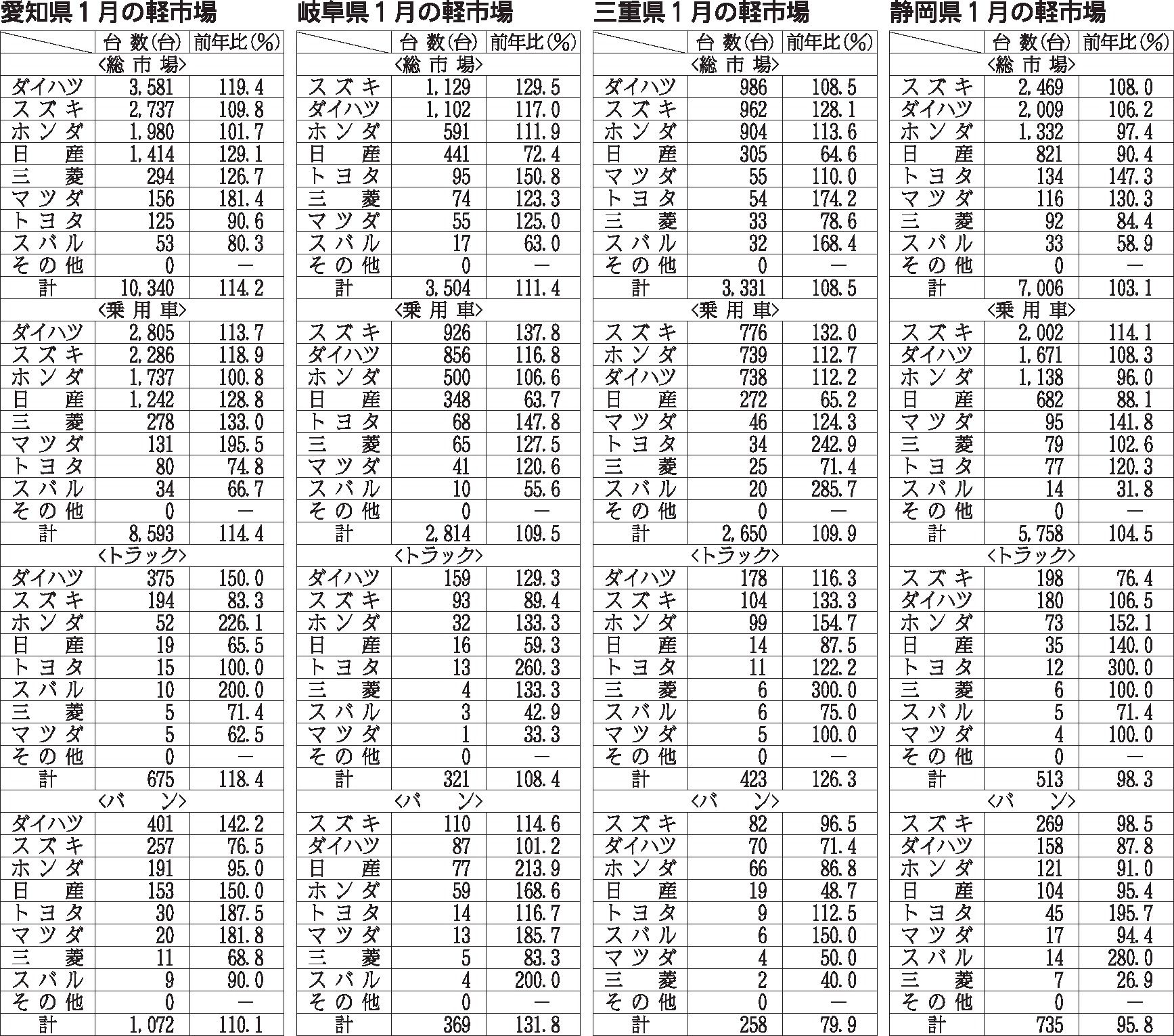 〈中部各県 1月の軽市場〉愛知県/岐阜県/三重県/静岡県
