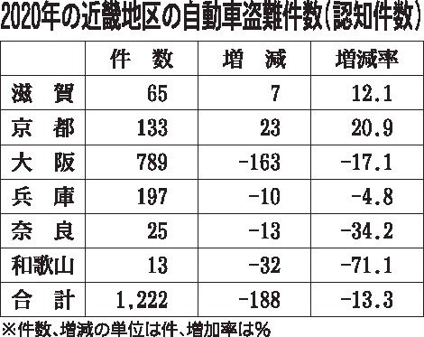 警察庁が公表した犯罪統計(2020年1~12月、暫定値)によると、近畿2府4県の20年の自動車盗難件数(認知件数)は前年比13・3%減の1222件だった。件数ベースでは188件減。検挙率は11・5㌽減の45・3%だった。 全体の6割超を占...