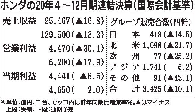 ホンダは9日、2021年3月期通期の営業利益と当期純利益を上方修正して発表した。新型コロナウイルス感染拡大の影響や半導体供給不足の影響を受けるものの、販売費抑制などコストダウン効果により、前回見通しに対し営業利益を1000億円積み増した。当期純利益は750億円上振れ、従来予想から一転、増益となる見込み。一方、売上高は下方修正した。