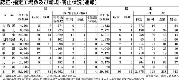 国土交通省は2015年8月末時点の認証・指定工場数および新規・廃止状況をまとめた。認証工場数は前月比25件増の9万2161件と、増加に転じた。指定工場数は19件増の2万9761件となり、3カ月連続で増加した。一方で専門認証工場は23件増の...