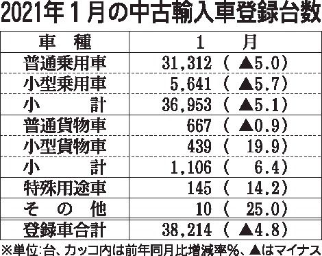 日本自動車輸入組合(JAIA、ティル・シェア理事長)が10日発表した2021年1月の中古輸入車登録台数は、前年同月比4・8%減の3万8214台と8カ月ぶりに前年を下回った。 ブランド別では、メルセデス・ベンツが同5・1%減の8233台、B...