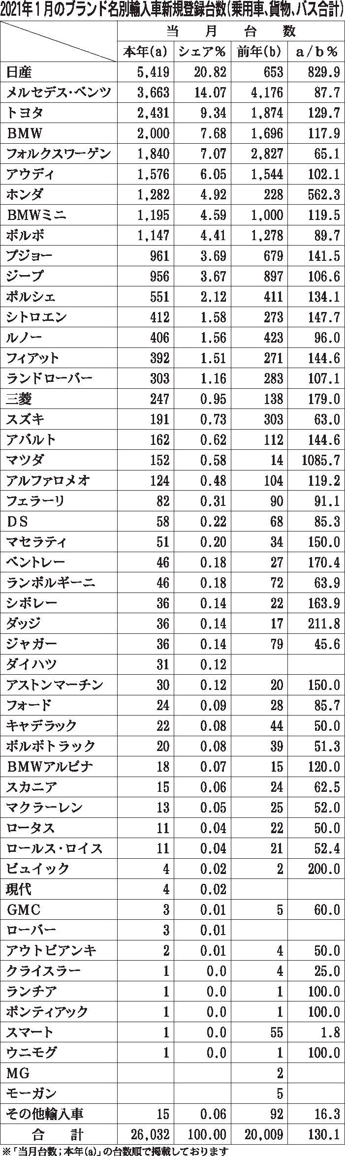 〈2021年1月のブランド名別輸入車新規登録台数(乗用車、貨物、バス合計)〉