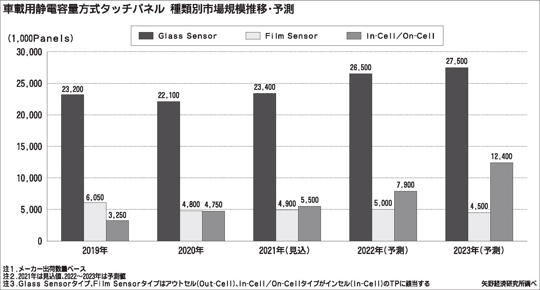 電気自動車(EV)シフトでビジネスチャンス拡大―。矢野経済研究所は、車載用ディスプレーに関する調査結果を公表した。主要部材である静電容量方式タッチパネルについては種類別の市場規模を予測。ディスプレーがタッチセンサーを内蔵する方式「インセル...