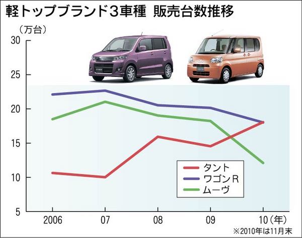 2010年軽車名別販売 タントか、ワゴンRか 7年ぶり首位交代も