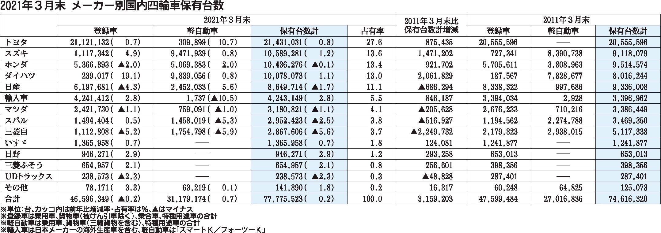 国内の四輪車保有台数、1000万台超えはトヨタ・スズキ・ホンダ・ダイハツの4社 HVと軽が成長をけん引