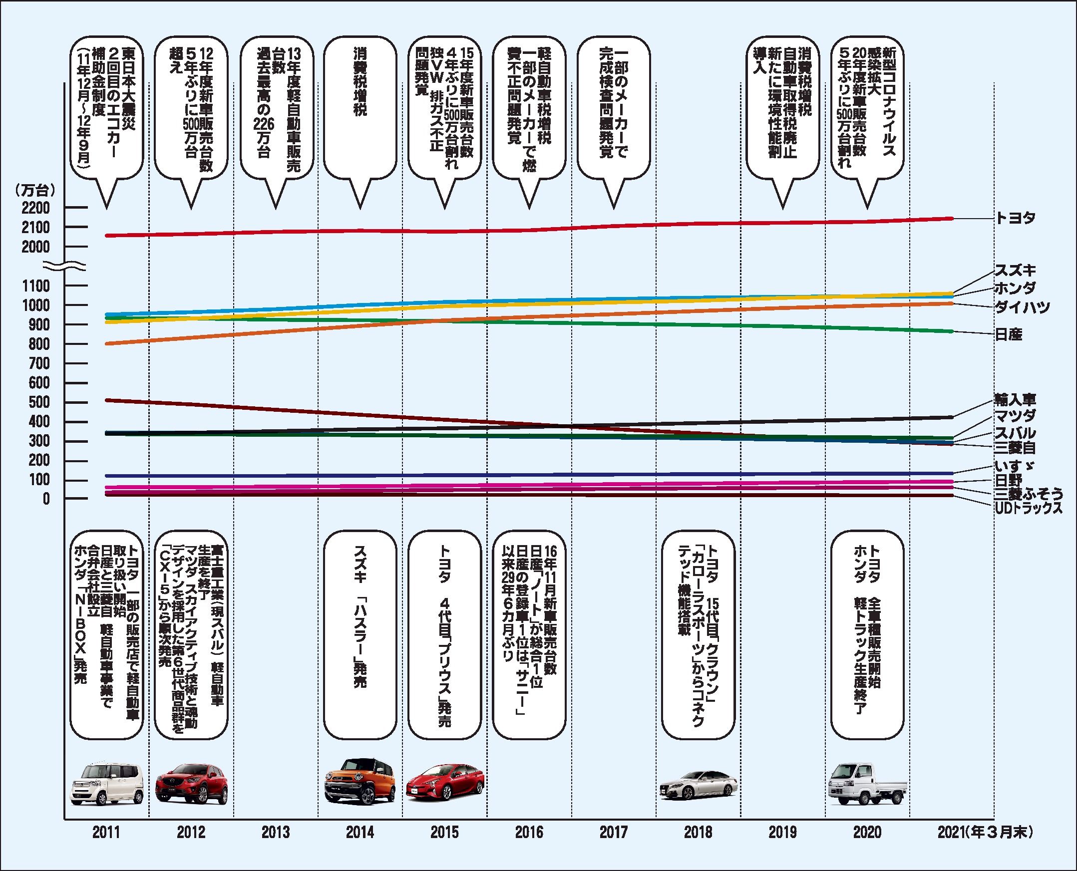 国内の四輪車保有台数(3月末時点)が1千万台を超える自動車メーカーは、ダイハツ工業が今年新たに加わって計4社となった。2千万台超のトヨタ自動車に続く「1千万台クラブ」の形成は、2014年のホンダ、16年のスズキと比較的最近の動きだ。過去1...