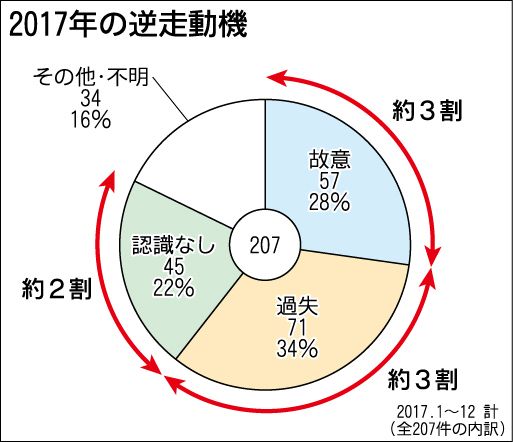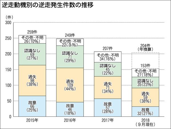 高速道路を故意に逆走するケースが後を絶たない。国土交通省がまとめた動機別の逆走発生状況によると、2017年の故意による逆走は前年より2割増加した。その大半は、目的のインターチェンジ(IC)を通り過ぎて戻ろうとした逆走が占める。高速道路全体...