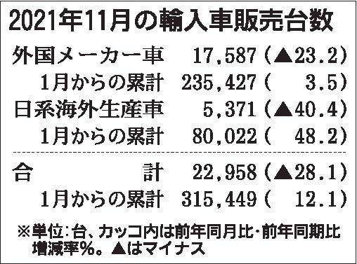 日本自動車輸入組合(JAIA、クリスチャン・ヴィードマン理事長)が6日発表した11月の外国メーカー車新規登録台数は、前年同月比23.2%減の1万7587台だった。半導体をはじめとする部品不足に起因する新車供給の遅れが響き、3カ月連続のマイナスとなったものの、マイナス幅は10月実績から8.9ポイント圧縮した。