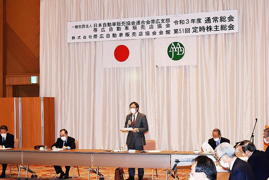 【帯広】日本自動車販売協会連合会(自販連)帯広支部(若林剛支部長)は、帯広市内のホテルで令和3年度通常総会=写真=を開き、今年度事業計画案などを承認した。コロナ禍で前年度は中止した交通安全総決起大会などの定例行事を、今年度は徹底した感染対...