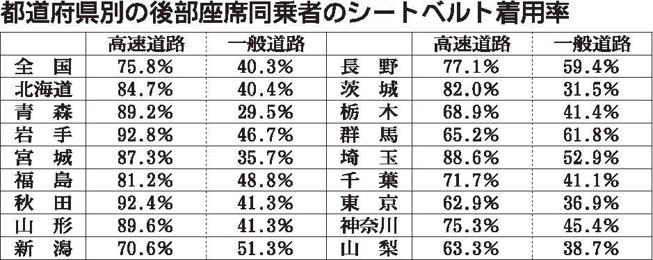 後席座席のシートベルト着用率、一般道の平均は40% 高速道は76%