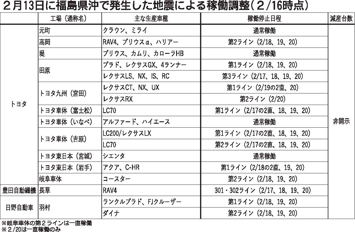 トヨタ自動車は16日、13日夜に福島県沖で発生した最大震度6強の地震の影響で生産調整を行うと発表した。関係会社を含む全15工場28ライン中、9工場14ラインで明日から週末にかけて稼働を停止する。供給が滞る部品や減産台数については明らかにしていないが、新型コロナの影響による5工場9ラインの稼働調整を発表した昨年4月15日には減産影響を約8万4000台と公表していた。