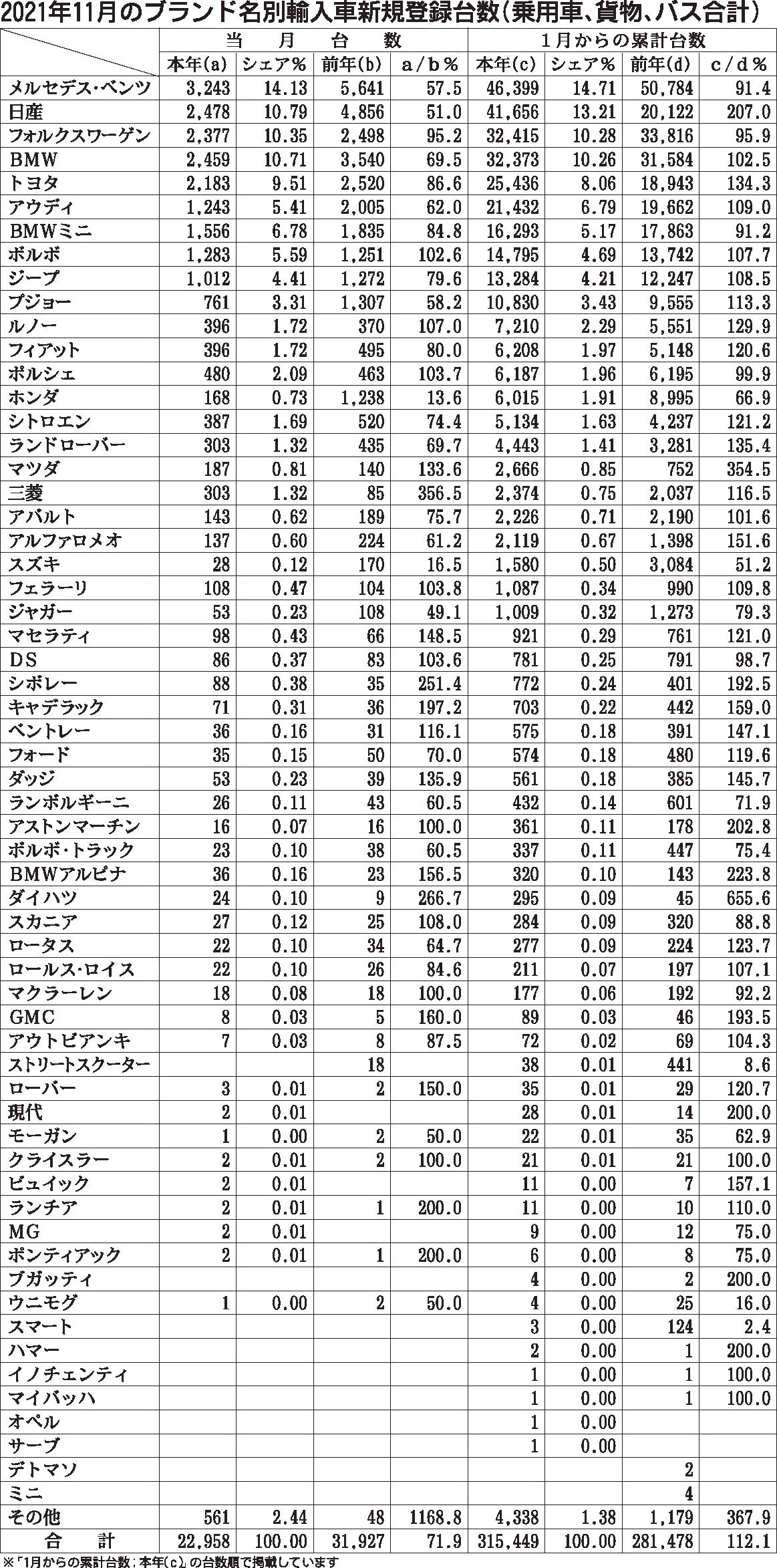 〈2021年11月のブランド名別輸入車新規登録台数(乗用車、貨物、バス合計)〉
