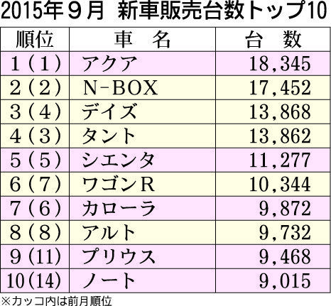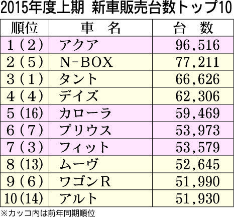 日本自動車販売協会連合会(自販連)と全国軽自動車協会連合会(全軽自協)は6日、2015年度上期(4~9月)の車名別新車販売ランキングを発表した。総合ではトヨタ自動車「アクア」が2年ぶりに首位を獲得した。11年12月発売以来、全面改良は実施...