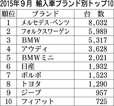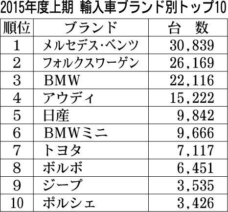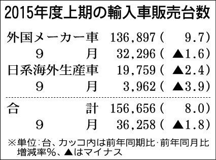 日本自動車輸入組合(JAIA)が6日発表した2015年度上期(4~9月)の外国メーカー車の輸入車新規登録台数は、前年同期比9・7%増の13万6897台だった。上期の登録車に占めるシェアは過去最高の9・2%を記録した。前年実績が消費増税に伴...