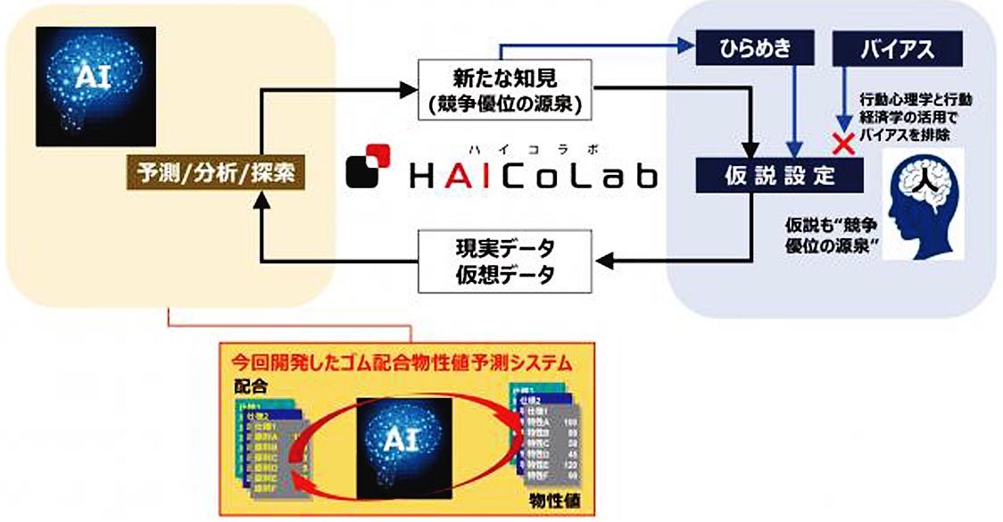 AI利活用構想「ハイコラボ」に基づいて開発した。配合設計パラメーターを入力すると、AIが予測される配合物性値を出力する。目標と近い配合を検索する機能なども付加した。
