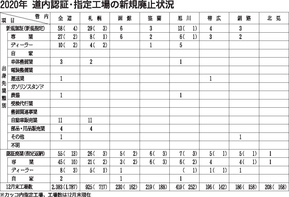 2020年の道内自動車分解整備工場の新規・廃止状況がまとまった。年間の新規認証工場数は前年より12工場多い58工場あった半面、認証廃業が55工場に上った。新規指定工場は4工場にとどまった。廃業の主な理由は自己都合など。 北海道運輸局による...