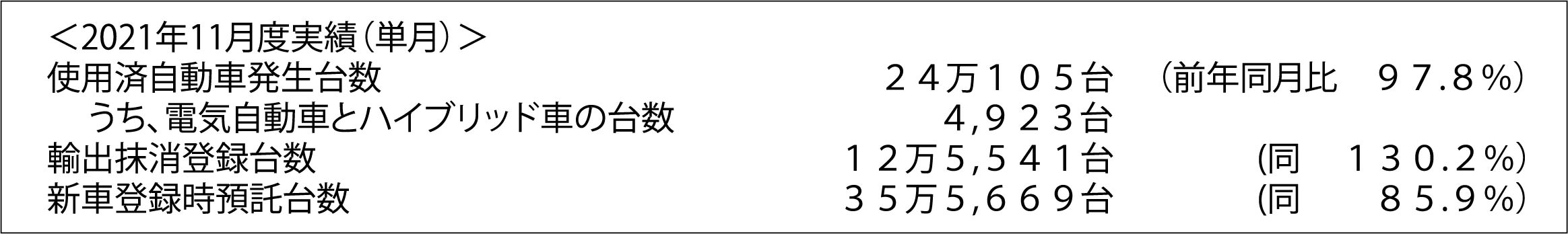 自動車リサイクル促進センター(代表理事:中村崇)が発表した2021年11月単月の使用済み自動車発生台数は24万105台(前年同月比97.8%)だった。このうち、電気自動車とハイブリッド車は4923台だった。