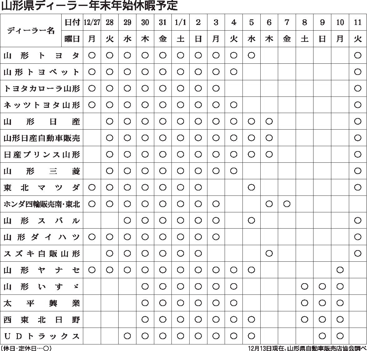 〈山形県ディーラー年末年始休暇予定〉2021/12/27~2022/1/11