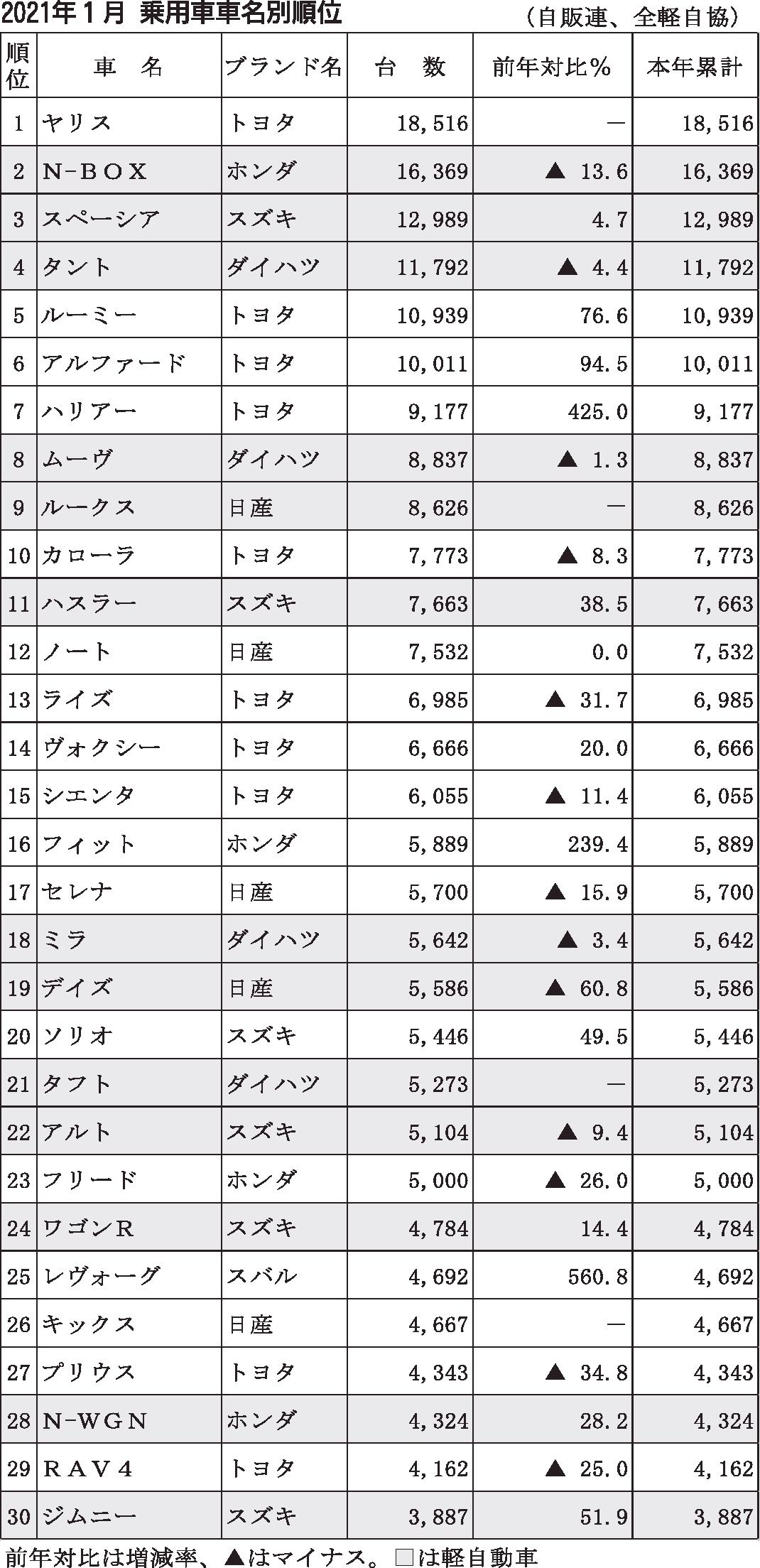 〈2021年1月 乗用車車名別順位〉