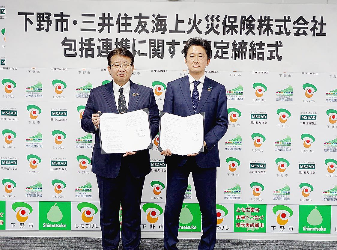 【宇都宮】三井住友海上火災保険栃木支店(松山裕宣支店長)は、下野市(広瀬寿雄市長)と包括連携に関する協定締結式を行った=写真。同支店が栃木県内で結ぶ同様の協定は、今回で3例目。 同社は地域の一層の活性化と市民サービスの向上を図ることなどを...
