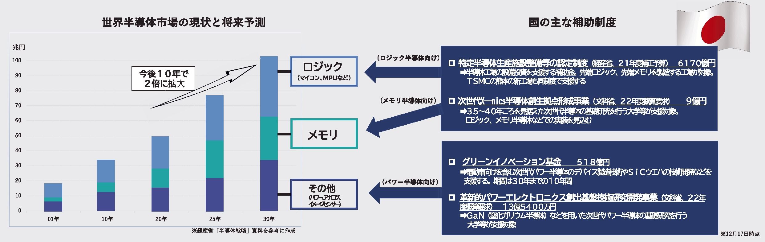 日本の半導体産業の再興へ―。投資を絞ったことで1980年代のピーク時に5割を占めていた世界シェアは1割弱にまで落ち込み、競争力を失った「日の丸半導体」。日本の半導体の需給率は3割を切っており、半分以上を輸入半導体に依存する。政府は日本の半...