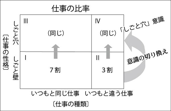「負の職業観」とは困ったものです。では、どうすればいいのでしょう。図は、これをひもとくために作成した「仕事の窓」です(初出:拙著『「働くこと」を企業と大人にたずねたい』東洋経済新報社、2011年)。 ヨコ軸は「仕事の種類」です。「いつもと...