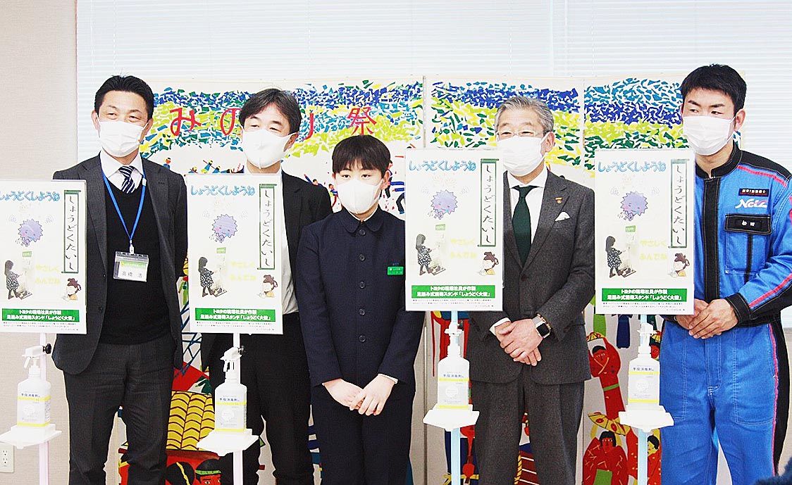 ネッツ山形、足踏み式消毒液スタンド「しょうどく大使」を山形大附属小に寄贈