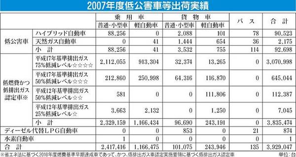 日本自動車工業会(自工会、青木哲会長)は20日、2007年度の低公害車出荷実績が前年度比3・9%減の392万9千台だったと発表した。国内新車需要の減少(同5・3%減)に歩調を合わせる形で低公害車の出荷も減ったが、このうちトヨタ自動車「プリ...