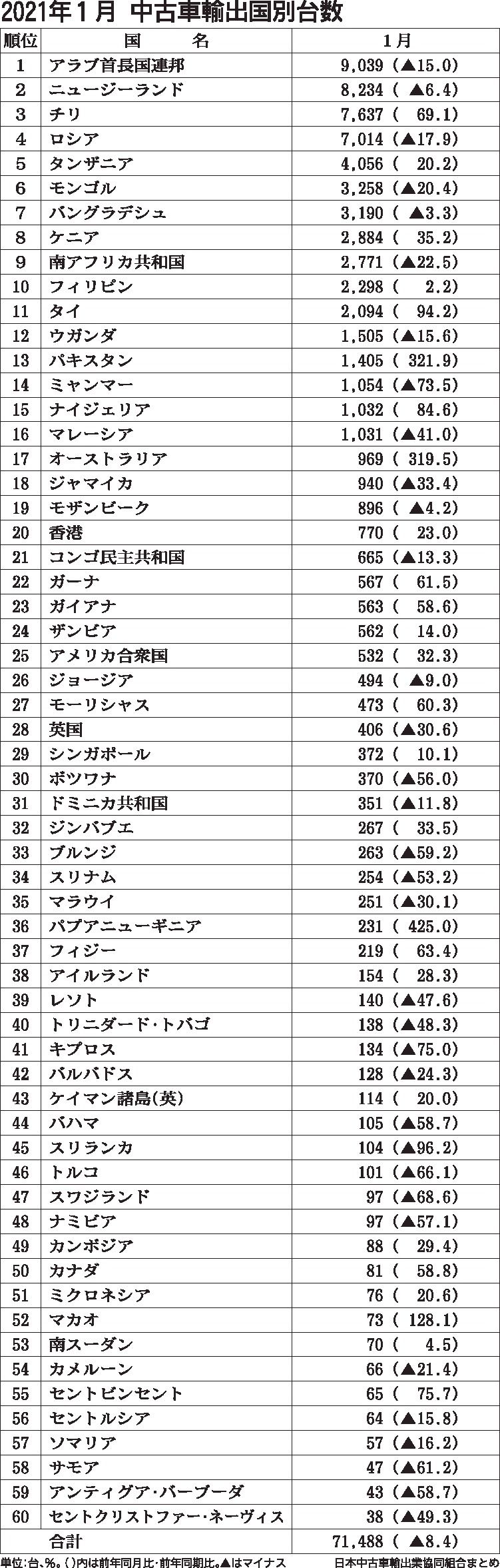 日本中古車輸出業協同組合(佐藤博理事長)がまとめた1月の中古車輸出台数は、前年同月比8・4%減の7万1488台だった。新型コロナウイルス変異株の広がりや、春節需要で中国に輸送用コンテナが滞留し、自動車輸出が停滞したことなどが実績に影響した...