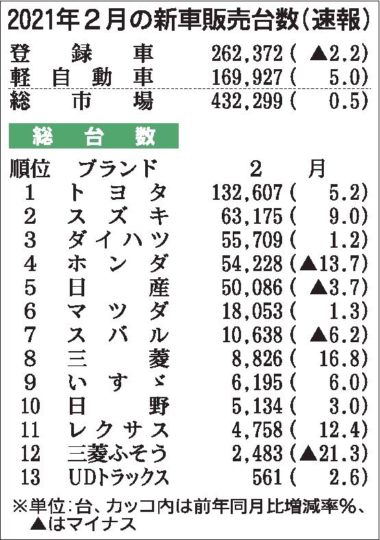 登録車と軽自動車を合わせた2月の新車販売台数は43万2299台となり、前年同月と比べて0・5%の微増にとどまった。前の月までは前年同月が2019年10月の消費税引上げによって低水準だったことから5%以上の伸びとなっていたものの、ここにきて...