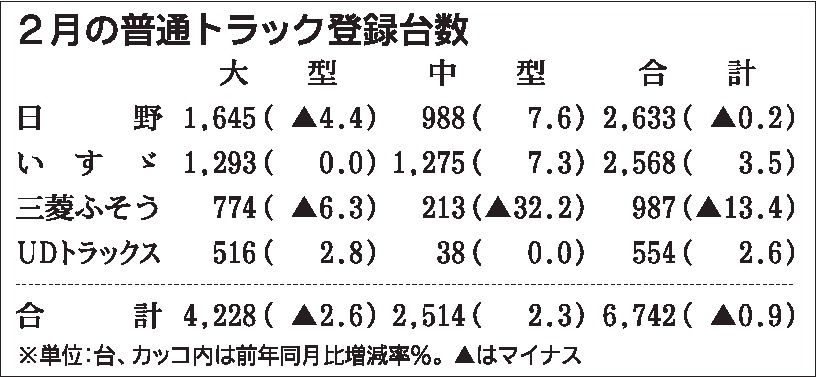 業界筋がまとめた2月の普通トラック新車販売台数は、前年同月比0・9%減の6742台だった。2カ月連続の減少となった。ただ、中型トラック(積載4㌧クラス)は同2・3%増の2514台と堅調だった。 メーカー別ではいすゞ自動車が同3・5%増の2...