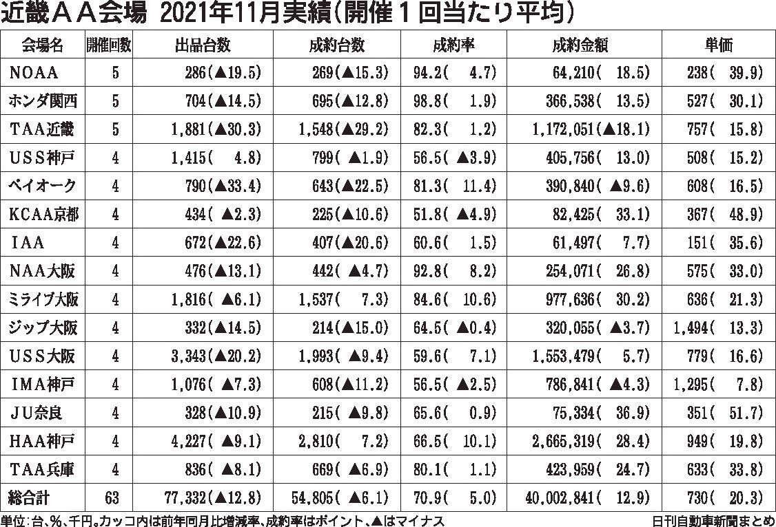 近畿地区11月AA、出品台数2カ月連続で2桁減 平均単価は2割超増