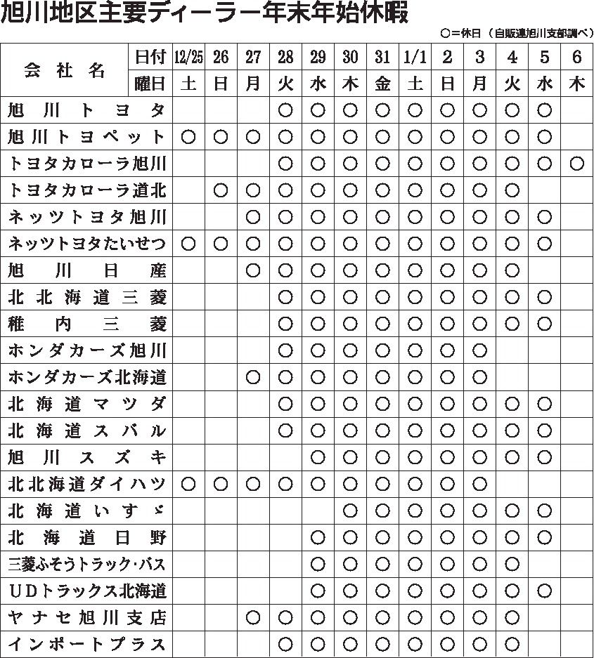 〈旭川地区主要ディーラー年末年始休暇〉2021/12/25~2022/1/6