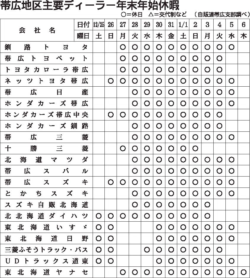〈帯広地区主要ディーラー年末年始休暇〉2021/12/25~2022/1/6