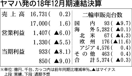 ヤマハ発動機は12日、2019年12月期の営業利益が2年連続で減益となる見通しを発表した。二輪車事業は欧州市場での販売の挽回や、フィリピン、ベトナムでの販売増加を見込むものの、原材料価格の上昇や為替変動、開発費の増加によって減益となる。 ...