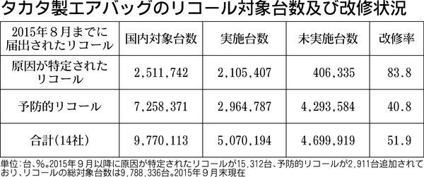 国土交通省は、タカタ製エアバッグのリコール(回収・無償修理)進ちょく状況を公表した。対象977万113台のうち、9月末時点で51・9%に当たる507万194台で改修を済ませ、残りは約470万台となった。 一方で、新たなリコールも届け出され...
