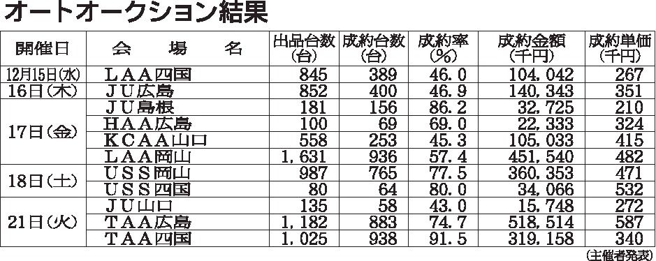 〈オートオークション結果〉中四国地区 2021/12/15~21