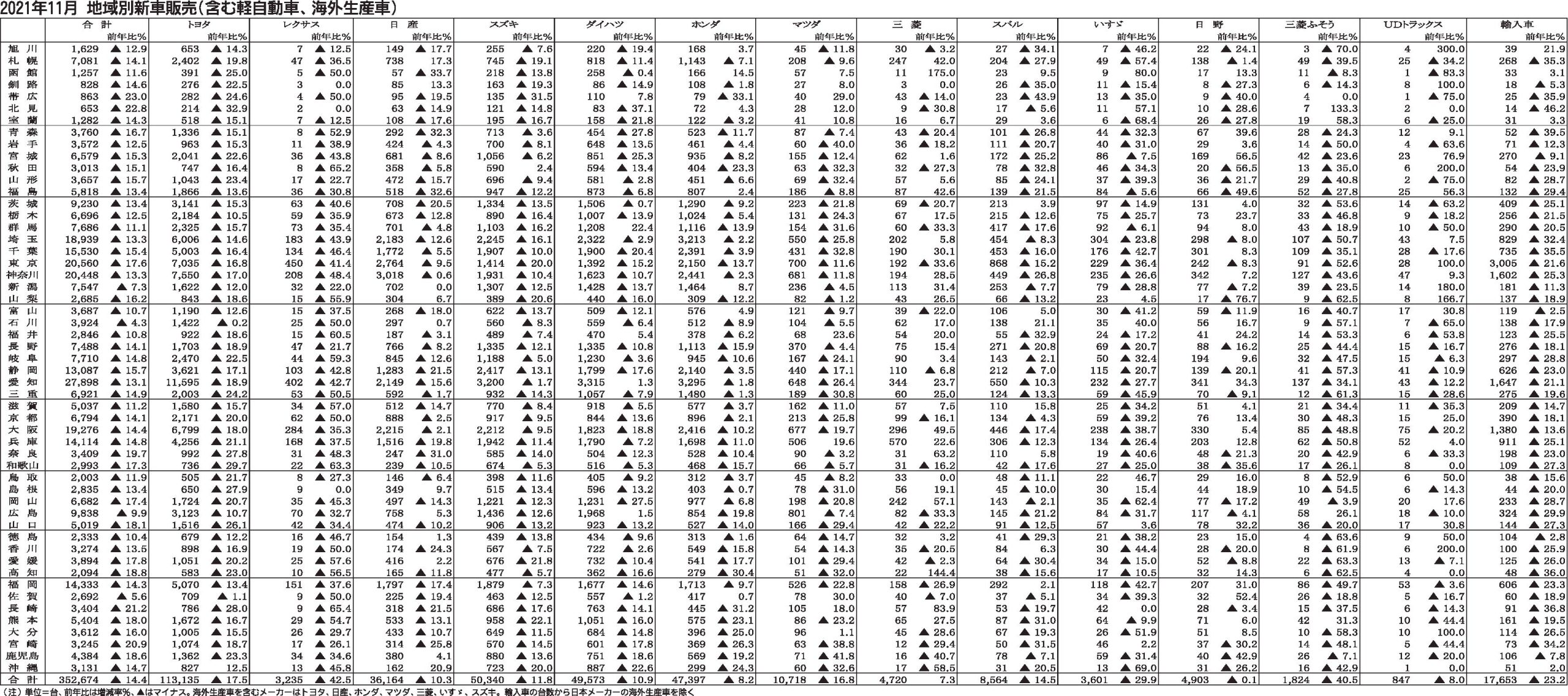 〈2021年11月 地域別新車販売(含む軽自動車、海外生産車)〉