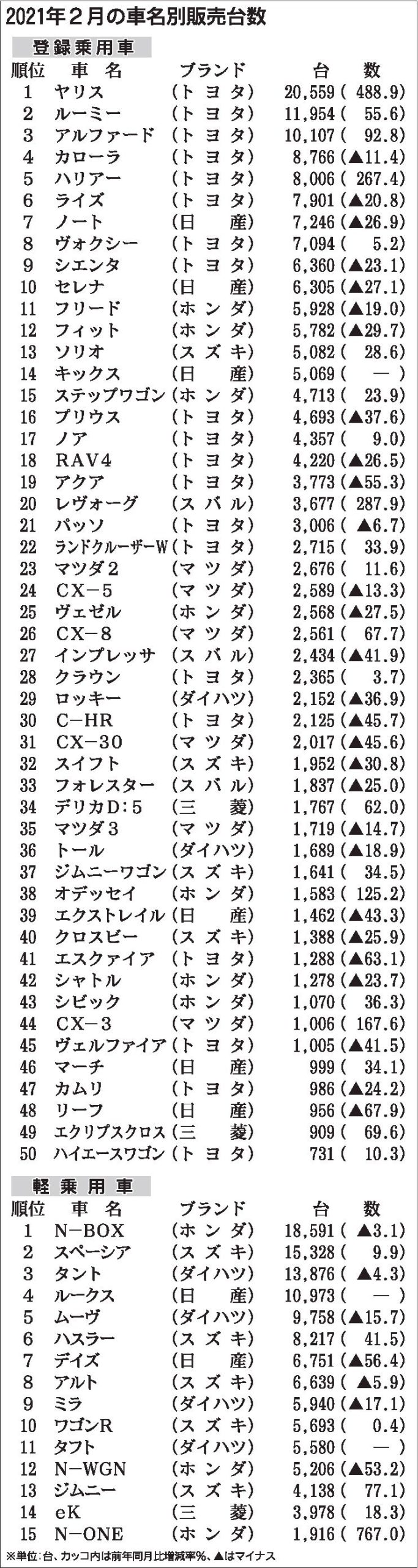 2021年2月の国内新車販売ランキング、「ヤリス」6カ月連続トップ 伸び悩む「N-BOX」