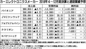 カーエレクトロニクスメーカー5社の2018年4~12月期決算が出揃った。ソフトウエアの開発費増加や中国市場の減速を要因に増益だった企業はJVCケンウッド1社にとどまった。通期業績見通しはパナソニック、クラリオン、アルプスアルパインの3社が...
