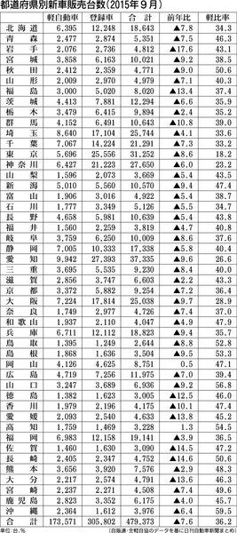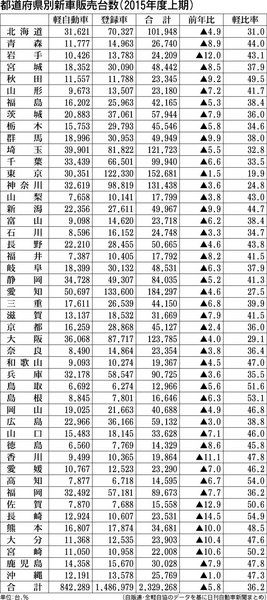 日刊自動車新聞は2015年度上期(4~9月)の都道府県別新車販売台数と軽自動車比率をまとめた。販売台数は全都道府県で減少、中でも長崎や佐賀など7県では2桁の減少となった。全都道府県で軽自動車が2桁のマイナスとなっており、登録車を含めた全体...
