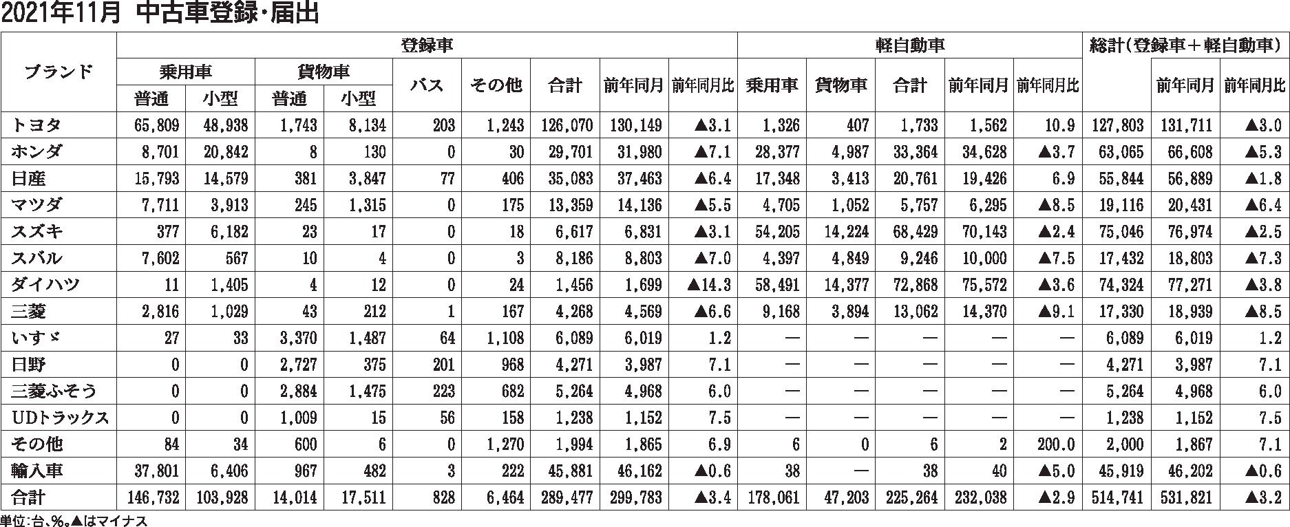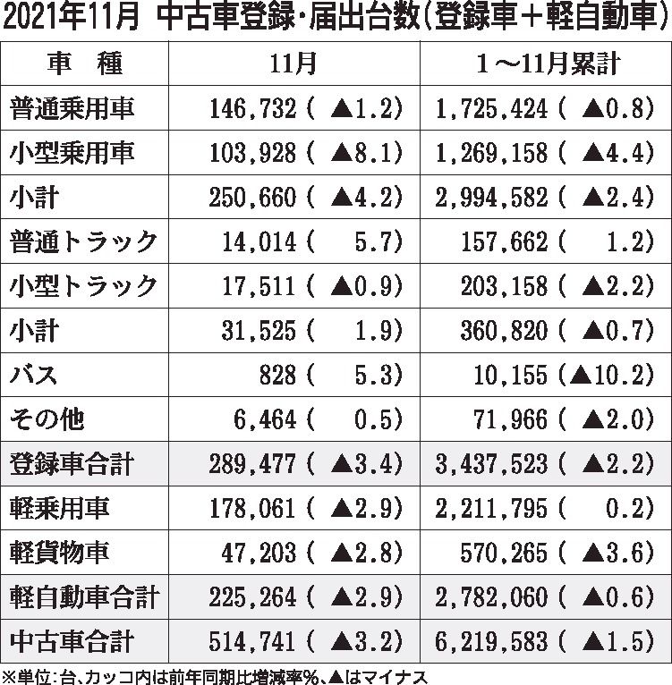 2021年11月の中古車登録・届け出台数、3.2%のマイナス