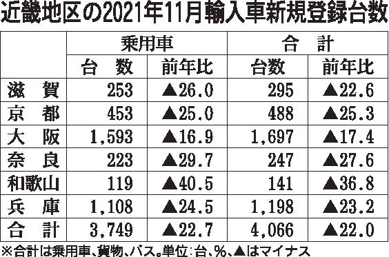日本自動車輸入組合(JAIA)の発表によると、2021年11月の近畿地区輸入車新規登録台数(外国メーカー車と日本メーカー車)は、前年同月比22・0%減の4066台となった。3カ月連続で前の年を下回り、半導体をはじめとする部品供給の停滞によ...