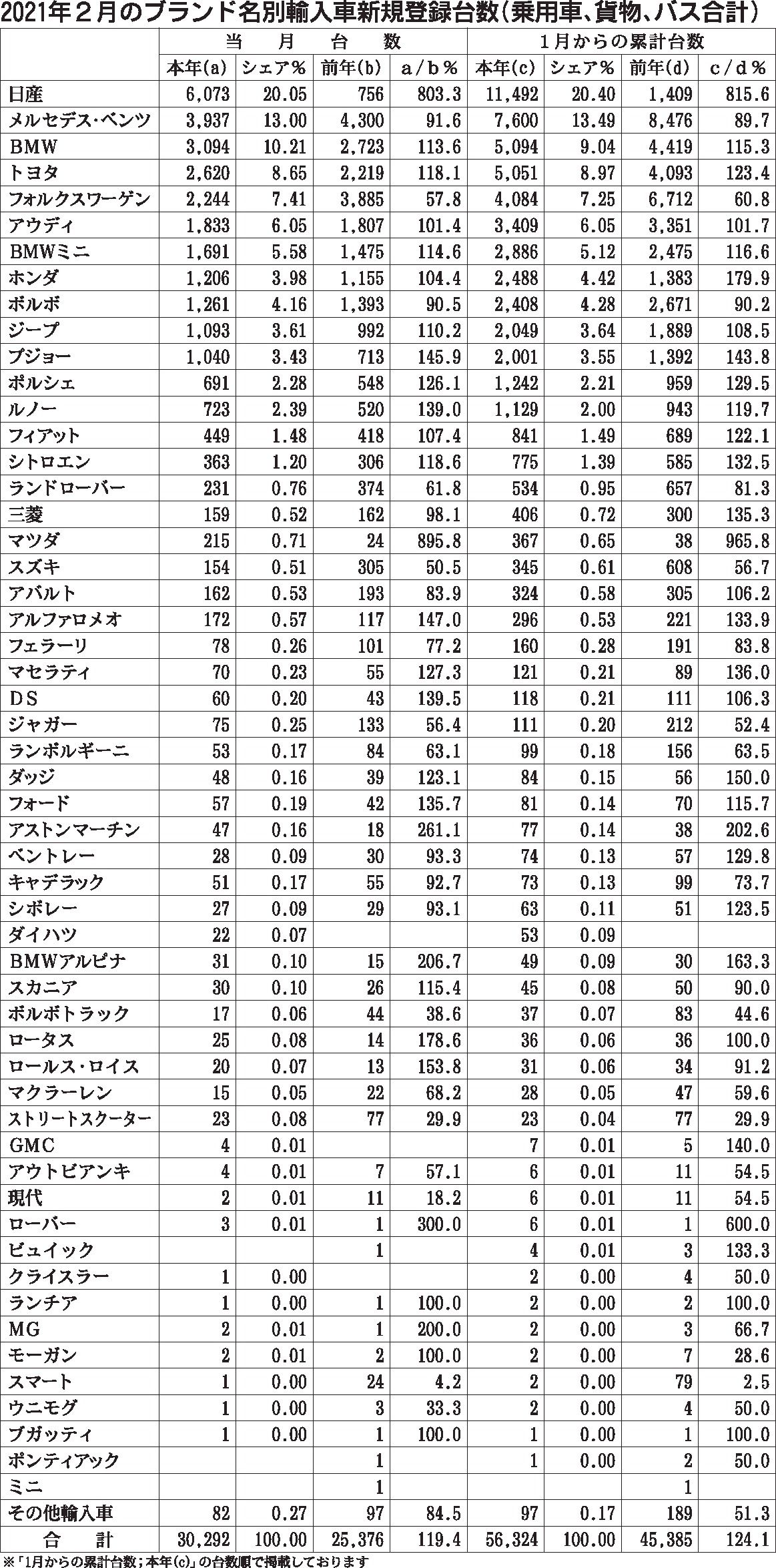 〈2021年2月のブランド名別輸入車新規登録台数(乗用車、貨物、バス合計)〉
