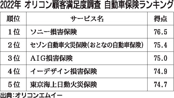 オリコンME(小池恒社長、東京都港区)は4日、「2022年オリコン顧客満足度調査」の結果を発表した。自動車保険の総合ランキングでは、ソニー損害保険が5年連続で1位となり、2位にセゾン自動車火災保険、3位にAIG損害保険が入った。ソニー損保...