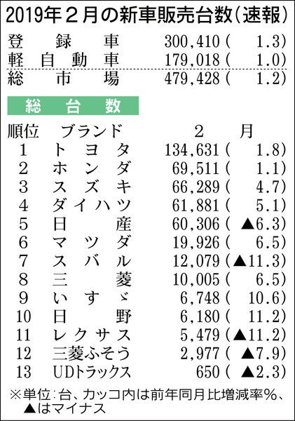 2月の新車販売(登録車、軽自動車合計)は、前年同月比1・2%増の47万9428台で2カ月連続で増加した。発売1年以内の新型車や軽のスーパーハイト系が市場を引っ張った。18年4月から19年2月までの総販売台数は461万台を超えており、3月が...
