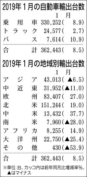 1月、四輪車輸出8.5%増 ホンダ倍増、スバル大幅減