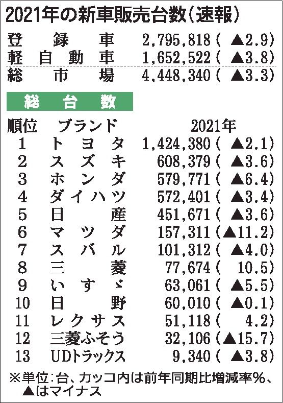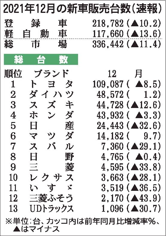2021年の新車販売台数は、登録車と軽自動車の合計で前年比3.3%減の444万8340台となり、2011年以来の450万台割れとなった。半導体不足や海外生産部品の調達難などによる自動車メーカーの減産が響き、コロナ禍で大幅に落ち込んだ20年の台数も下回った。メーカー各社が挽回生産への準備を進めてはいるものの、12月も2桁減となるなど振るわなかった。