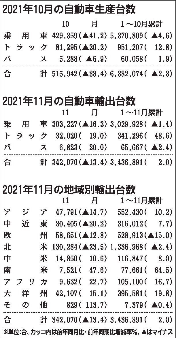 日本自動車工業会(自工会、豊田章男会長)がまとめた2021年11月の四輪車輸出台数は、前年同月比13.4%減の34万2070台だった。東南アジアでの新型コロナウイルス感染拡大などの余波で国内生産が減少し、4カ月連続のマイナスとなったものの、10月と比べて減少幅は縮小した。